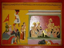 | Description / विवरण | Miniature painting based on Prithviraj Raso depicting Ravan meet Chandvardai and thinking in his mind how to capture Prithviraj. At the right side his attendants and army is depicted. |