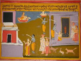 | Description / विवरण | Miniature painting based on Sanskrit drama Malti Madhav depicting Madhav telling Malti that Brahma is blessing them, then both of them start biting Aghorghant. |