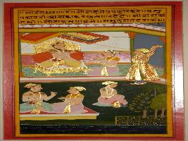 | Description / विवरण | Miniature painting based on Sarangadhar depicting philosophy of life. A man is great who help others, he would get his rewards and the reward is compared to the sea. A king is shown sitting on throne and a man is sitting nearby asking for help with folded hands. Behind him another man is shown wearing coat at the upper part. |