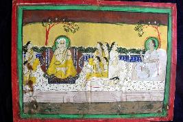 | Description / विवरण | In this painting saint Gusai ji, Bhallabhcharya, Vidhulji alongwith his disciples are sitting and listening to discourse. Halo can be seen behind the saints. |