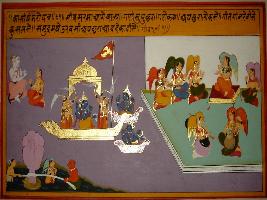 | Description / विवरण | Miniature painting based on Kashi khand depicting Shivsharma talking to a woman. Vishnu is flying on viman with servants, apsaras depicted playing musical instruments and on the lower part is the depiction of Samudra Manthan. |