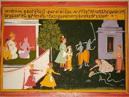 | Description / विवरण | Miniature painting based on Sanskrit drama Malti Madhav depicting Kamandaki informed Bhuri Vasu about Madhav and Malti. It also depict Madhav killing Aghorghant. |