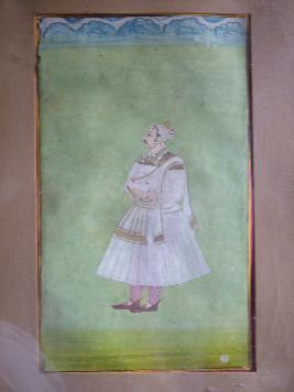 | Description / विवरण | This miniature painting representing Sursingh of Jodhpur who is in standing posture and shown from lateral view. He is wearing a designed tunic, tight trouser, a decorated crown, designed shoes, few necklaces of beads. Also scarf can be seen on this shoulder. It is mounted in a wooden frame now. |