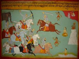 | Description / विवरण | Miniature painting based on Prithviraj Raso depicting Prithviraj s army fighting with the army of Jaichand. Soldiers are depicted on their horseback and are fully armed. At the extreme left two dark men are shown dancing. Sages are shown meditating and king is shown on mountain. |
