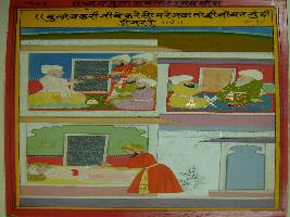 | Description / विवरण | Miniature painting based on Mullah-do-Piyaja. It depicts Mullah-do-Piyaja talking with Akbar where Mullah says to Akbar that a Bakry is kill up to cart stage while on the painting some nobles are seen on the painting. |