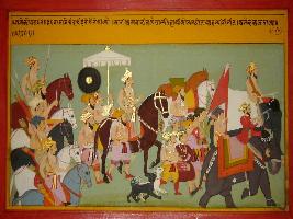 | Description / विवरण | Miniature painting based on Prithviraj Raso depicting procession of Chandela king Jaichand. king sitting on horseback and an attendant is holding canopy nearby. |