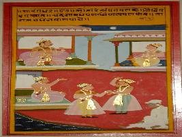 | Description / विवरण | Miniature painting based on Sarangadhar depicting a king sitting in his palace at the upper right side and a prince sitting in his palace at the opposite side. In the lower part, a man is shown sitting with coins. At the lower left side, an old man is shown sitting. |