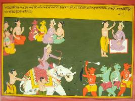 | Description / विवरण | Miniature painting based on Mahabharat - Rajdharma parva. On the painting Vyas says demons and Devtas are some but demon are do only the wrong things while Devtas are always pay respect to Brahmans and have to fight against the demons. |