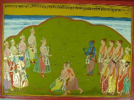 | Description / विवरण | Miniature painting based on Mahabharat - Adi parva depicting Kauravas and Pandavas standing face to face and Bhim fighting. |