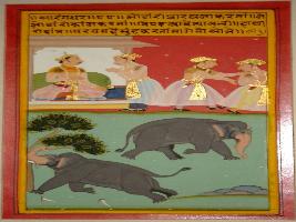 | Description / विवरण | Miniature painting based on Sarangadhar depicting a man standing in front of a king. An elephant breaks his tusks in the futile effort of striking a tree. |