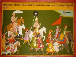 | Description / विवरण | Miniature painting based on Prithviraj Raso depicting army of Raja Jaichand marching with his men. |