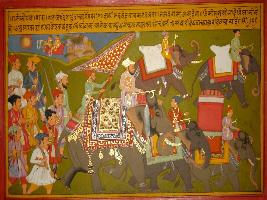 | Description / विवरण | Miniature painting based on Prithviraj Raso depicting procession of Chandela king Jaichand, In front of his men hundred elephants are marching with rider sitting on them. Elephants are fully decorated. Behind the, men with rifles are marching. At the top right some goddess are sitting on their viman with garlands. |