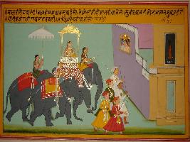 | Description / विवरण | Miniature painting based on Sanskrit drama Malti Madhav depicting Kalhans telling Madhav about the arrival of Malti on elephant back. |