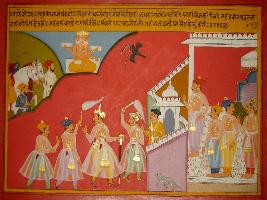 | Description / विवरण | Miniature painting based on Prithviraj Raso depicting Chandela king Jaichand come down from his horse. His horse is shown with attendant at upper right. At the middle king Jaichand is shown talking to one of his Sardar. He is shown with lots of Rajput Sardar and entering a palace which is also full of Rajputs. At the middle top, Brahma is shown. |
