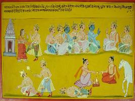 | Description / विवरण | Miniature painting based on Mahabharat - Rajdharma parva depicting that the king of Bhirat talking with Pandavas and Krishna and asking them that by punishing Duryodhan for his misbehaviour with Draupadi is the true dharma that followed by Pandavas. |