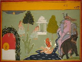 | Description / विवरण | Miniature painting based on Sanskrit drama Malti Madhav depicting temple of Shiv. It also depicts four armed Ganesh coming out from water. An elephant and 2 peacocks are depicted on a mountain on the right side of the painting. |