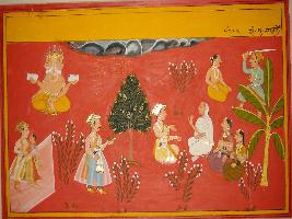 | Description / विवरण | Miniature painting based on Sanskrit drama Malti Madhav depicting natas performing the drama. On the upper right Brahma is depicted. At the left side Kamandaki probably talking to Makarand probably .Two women are sitting with her. |