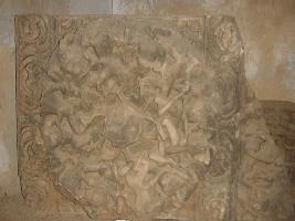 | Description / विवरण | A sculptured architectural fragment, probably part of ceiling, depicts flying celestial, musicians and celestial dancer forming a circular row during their performance. |