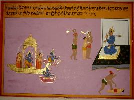 | Description / विवरण | Miniature painting based on Kashi khand depicting Vishnu, two Ayudh purush, Yam with two yamdoot and a man. Shivsharma telling to the Ganas that if a man does something wrong than he would be finished by Yam. |