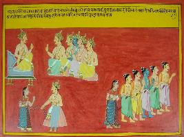 | Description / विवरण | Miniature painting based on Mahabharat - Rajdharma parva depicting Yudhisthir sitting with rest of Pandavas at the upper right part. Below this Dushashan is shown pulling Draupadi s clothes. At the left Pandavas is shown going to forest for exite. |
