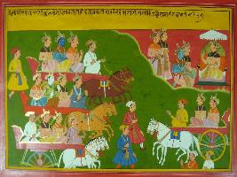 | Description / विवरण | Miniature painting based on Mahabharat - Adi parva depicting Arjun and Krishna coming towards Indraprastha and Yudhisthir sending Nakul and Sahdev to welcome them. |