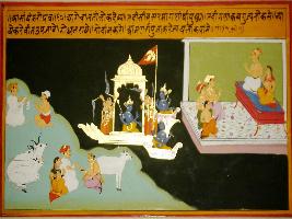 | Description / विवरण | Miniature painting based on Kashi khand depicting Shivsharma going to Indralok at upper middle part. At the right side, two men are shown reading religious text. Below it a man is shown giving cow to a Brahman. At the left side, people are shown sitting in the Indralok in front of Indra. |
