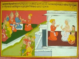 | Description / विवरण | Miniature painting based on Mahabharat - Ashramvas parva depicting Dhritrashtra telling Sanjay about his decision of going to vana forest . They are shown sitting and talking along side of Gandhari at left part. At the right part, Vidur goes to Pandavas and tell Yudhisthir about his decision leaving for forest with Dhritrashtra. |
