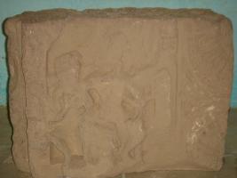 | Description / विवरण | An architectural fragment, depicting two figures probably Nara -Gauri , sitting on lalitasana. The figure are completely mutilated. No figures or attributes are visible. |