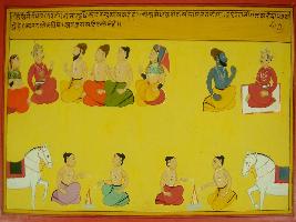 | Description / विवरण | Miniature painting based on Mahabharat - Rajdharma parva depicting sage Vyas asking Yudhisthir to perform Ashwamegh yagna as it reduces sins. Then he says that Indra also performs this in heaven. |