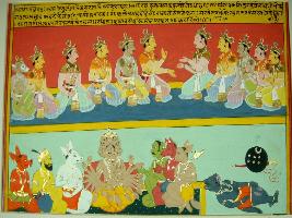 | Description / विवरण | Miniature painting based on Sarangatattva - an independent work of Sankhya school of philosophy. In the upper part, gods are seated and discussing with each other. In lower part, a ten headed and twenty armed demon is seated with his companions in his court. |
