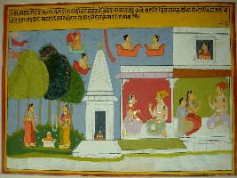 | Description / विवरण | Miniature painting based on Kashi khand depicting two women worshipping Shiv linga, on its left Shiv temple is seen. Above it Devta and Apsara are seen seated on the Vayuyaan, on its left a man seated with a woman and on its left a man seated with a woman and child. At the lower part of the painting a river is also seen. |