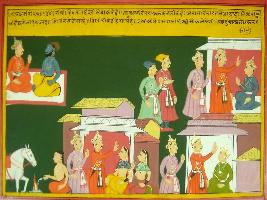 | Description / विवरण | Miniature painting based on Mahabharat - Rajdharma parva depicting Vyas is telling Yudhisthir to perform Aswamedh yagna. He says that sages and gods serves Indra. He could won the earth by your power and rule over it. |
