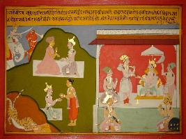 | Description / विवरण | Miniature painting based on Prithviraj Raso depicting Prithviraj giving bida to Jaichand and blood is coming from his hand at upper left part. Below this Chandvardai is shown telling a shlok to Jaichand. Scene of Prithviraj giving Bida is compared with Brahman giving tulsi and sage giving vibhuti to king and they are depicted at left part. Indra is depicted fighting with a demon at upper right. |