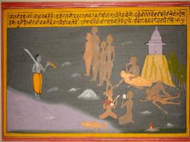 | Description / विवरण | Miniature painting based on Sanskrit drama Malti Madhav depicting Madhav telling a story. Madhav holding a sword and one piece of leg and saw devils looking at him. One of the devil eating flesh while other putting poisonous teeth on body. One female devil wearing earring of hand and one is drinking blood. |