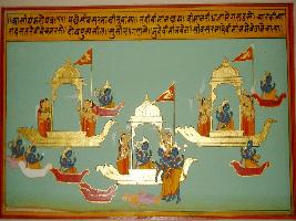| Description / विवरण | Miniature painting based on Kashi khand depicting departure of Shivsharma from Mrityulok. Shivsharma shown lying dead at lower middle. A viman having four female attendants coming to take him to Vishnulok. He is shown leaving to Vishnulok. |
