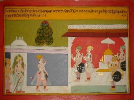 | Description / विवरण | Miniature painting based on Prithviraj Raso depicting chief Samant talking to king Jaichand and telling him that he will catch Prithviraj. Then he called Ravan for the service. |