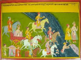| Description / विवरण | Miniature painting based on Mahabharat - Ashramvas parva depicting crossing of Yamuna river by the army of Yudhisthir and reaching a Ashram. |