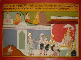 | Description / विवरण | Miniature painting based on Prithviraj Raso depicting court of king Jaichand who is ordering his minister to get ready for the war. |