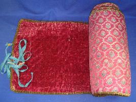 | Description / विवरण | Waist band Kamar peti of velvet cloth, with maroon base and floral designs in a rhombus shaped bracket. it is padded with dark pink colour from inside. |