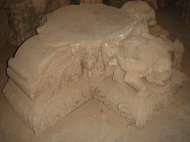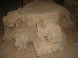 | Description / विवरण | A sculptured architectural fragment of roof of a pillar depicting two Varbahi gandharva , Kichak one s right hand and head is chopped off and both are wearing necklaces, armlet and sacred thread. On elephant is also depicting whose two legs are chopped off and some architectural carving both the sides. |