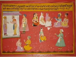 | Description / विवरण | Miniature painting based on Sanskrit drama Malti Madhav depicting in upper right part, two persons are talking in a room while one person is standing outside. In upper left part, Madhav and Makarand are sitting with Kamandaki, Lawangika, Malti and her friend. In lower right part 2 males are depicted in conversation. |