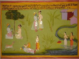 | Description / विवरण | Miniature painting based on Sanskrit drama Malti Madhav depicting depicts Madhav telling his friend Makarand that he become unconcious and fell on the ground by seeing the miserable condition of Makarand. a woman came and woke him up and them he saw two women taking bath in river. |