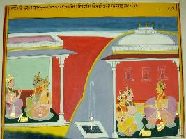 | Description / विवरण | Miniature painting based on Sarangatattva - an independent work of Sankhya school of philosophy. In the left side three men are sitting together and discussing, in the right side is a king with two nobles in a palace. |