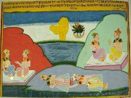| Description / विवरण | Miniature painting based on Sarangatattva - an independent work of Sankhya school of philosophy. In the centre there is depiction of a water body and two men lying on an island. In the left and right sides, there are two men talking. |