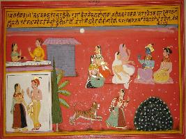 | Description / विवरण | Miniature painting based on Sanskrit drama Malti Madhav depicting a scene in which a couple in the house and at the top talking to each other. Madhav and his friend telling something to four seated female, two female seated at the front one is white dress, but the seated female is back are in beautiful dress. Below at the middle a tiger is attacking on a female. |