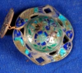 | Description / विवरण | Iron phool bob of a shield having four fishes at the outer side and floral design in the middle part. It is enamelled, colours are flaking off. |