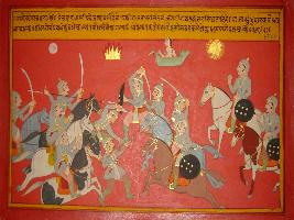 | Description / विवरण | Miniature painting based on Prithviraj Raso depicting vigorous war between armies of Prithviraj and king Jaichand. Prithviraj is depicted with companions like Langri Rai, who is his commander. |