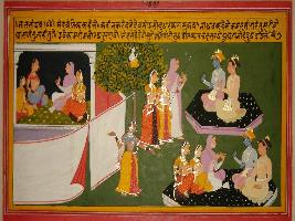 | Description / विवरण | Miniature painting based on Sanskrit drama Malti Madhav depicting. Malti sitting with Kamandaki and Madayantika at the top right. In the left part, Madhav is shown talking to Kamandaki and Madayantika. Writing on top describing Madhav is asking Malti to perform a puja so that their wish could be fulfilled. |