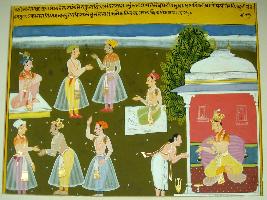 | Description / विवरण | Miniature painting based on Sarangatattva - an independent work of Sankhya school of philosophy depicting a man sitting on asana at the upper right side. Next to him a man is describing his dream to another person. Next to them a man is seen sitting on a coach. At the lower part a man is seen offering daan to another person, behind whom another person is seen. At the lower left corner a king is seen offering daan. |