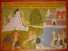 | Description / विवरण | Miniature painting based on Prithviraj Raso depicting Langri Rai marching forward to fight with Jaichand s army. On the way he saw a tiger and killed it. |